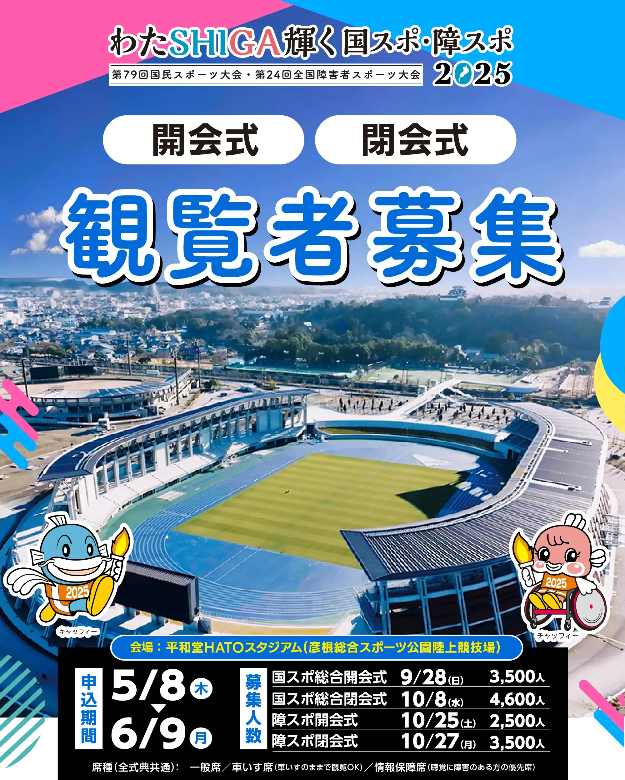- 第2条 わたSHIGA輝く国スポ・障スポ実行委員会事務局(以下「実行委員会」という。)は、次のとおり、総合開会式および総合閉会式ならびに開会式および閉会式(以下「4式典」と総称する。)の一般観覧者を募集します。