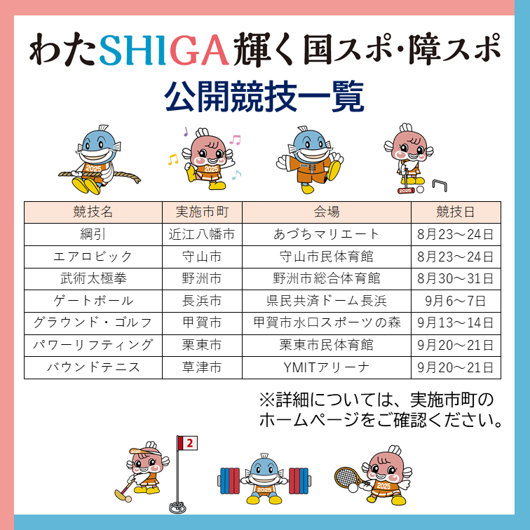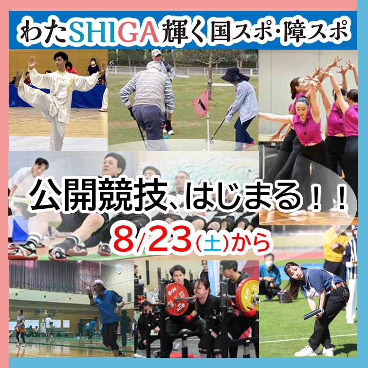 明日8月23日(土)から、「わたSHIGA輝く国スポ」の公開競技(全7競技)が、県内7会場で開催されます!みなさんの声援が選手を後押しする力になります✨入場無料となっていますので、ぜひ会場にご来場いただき、みんなで熱い声援を送りましょう!