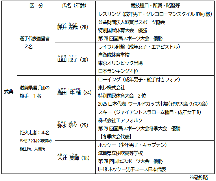 「わたSHIGA輝く国スポ」および「わたSHIGA輝く障スポ」の各開会式において、式典の重要な役割となる選手代表宣誓者、旗手および炬火走者を務める選手が、次のとおり決定しました。
