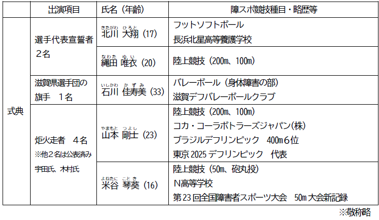 わたSHIGA輝く国スポ・障スポの開会式における選手代表宣誓者、旗手および炬火走者が決まりました