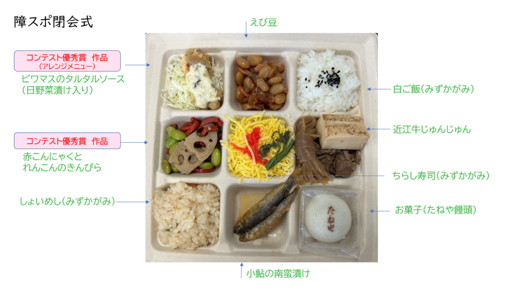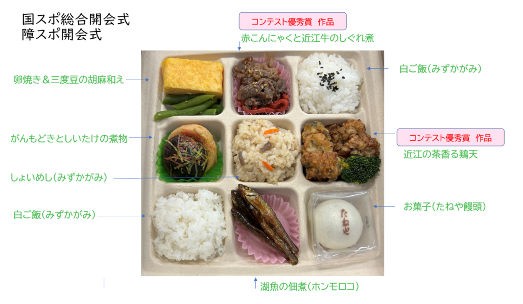 この度、わたSHIGA輝く国スポ・障スポの開・閉会式において、選手や招待者等に提供する「式典弁当」のメニューが完成したので、お知らせします。