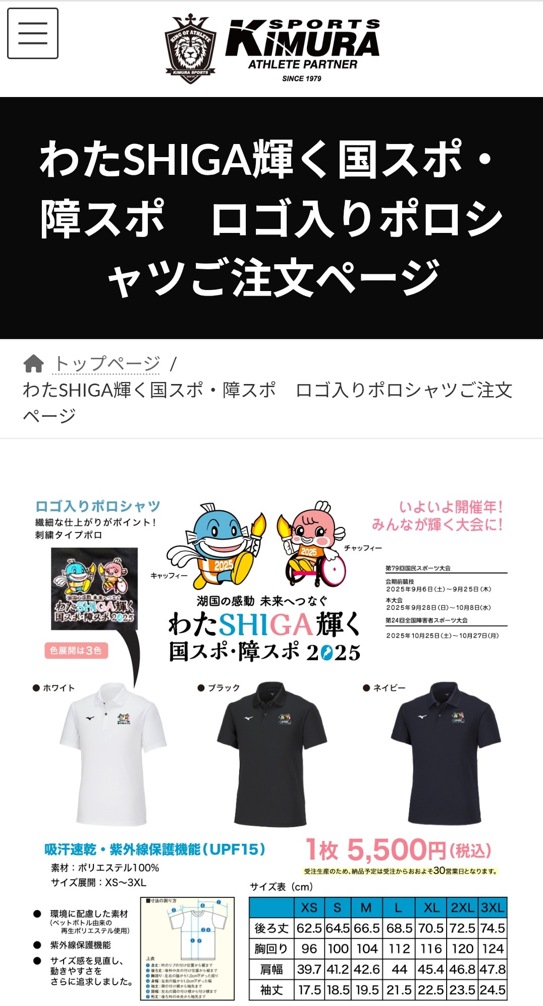 | (株)スポーツショップキムラ | 「わたSHIGA輝く国スポ・障スポ」刺繍ポロシャツ | ![]() | https://www.spkimura.com/watashigapolo/ | 「わたSHIGA輝く国スポ・障スポ」刺繡ポロシャツです。 大会愛称・スローガン・マスコットキャラクターを繊細な刺繍で仕上げています。 吸湿速乾・紫外線保護機能あり。 ミズノ製。 |
