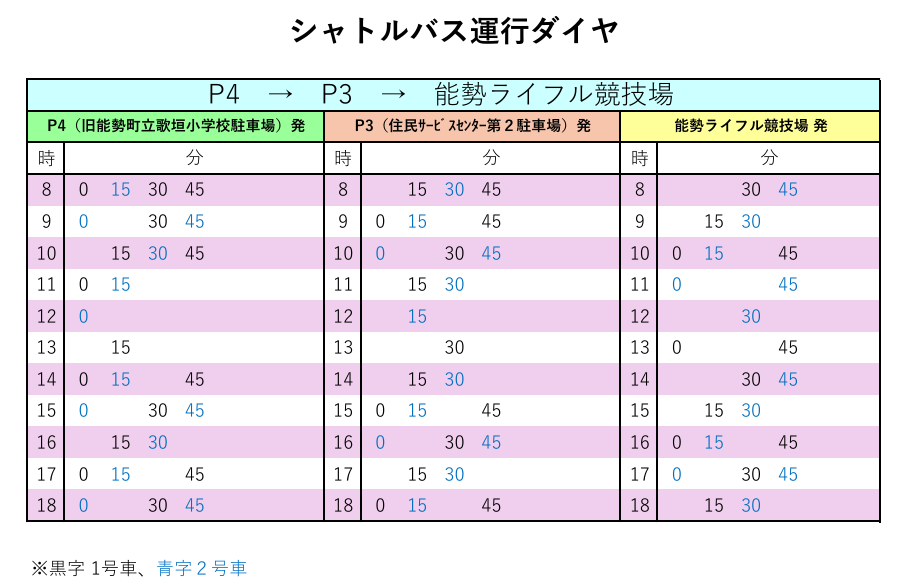 応援者/一般観覧者駐車場から競技会場へのシャトルバス運行表