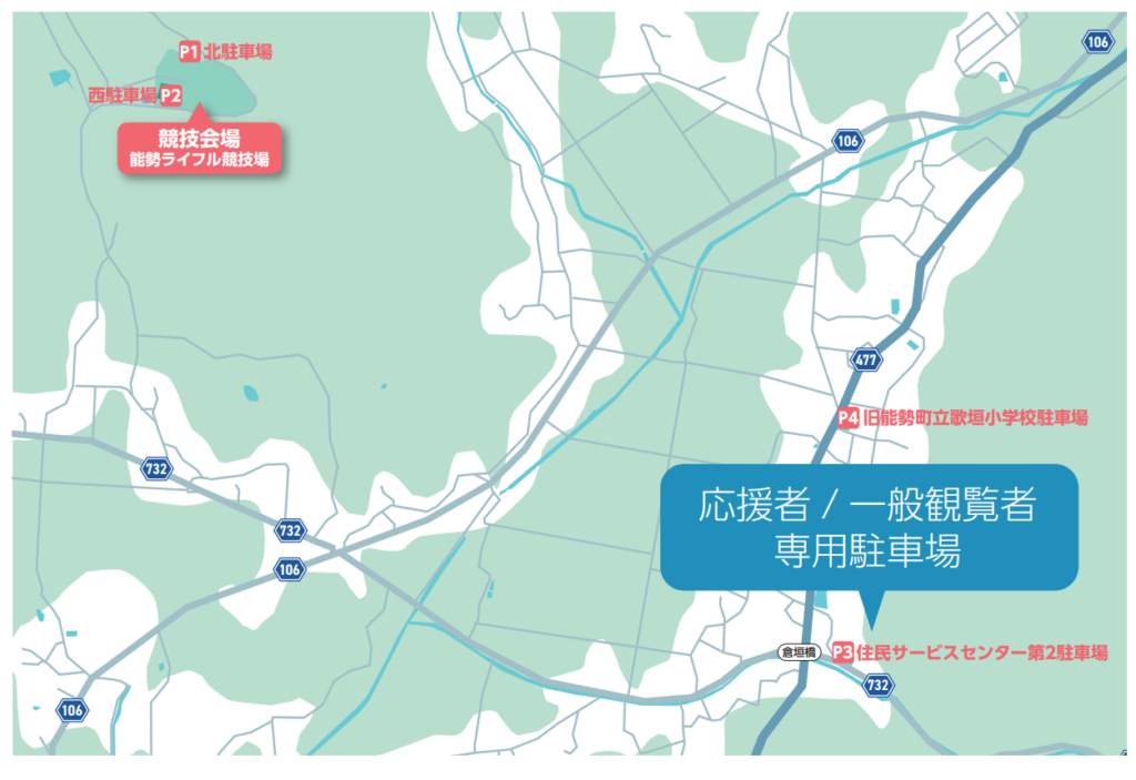 わたSHIGA輝く国スポライフル射撃(50m、10m、BR・BP)競技会に来会される応援者/一般観覧者駐車場については、競技会場より車で約 5 分の場所にご用意しております。