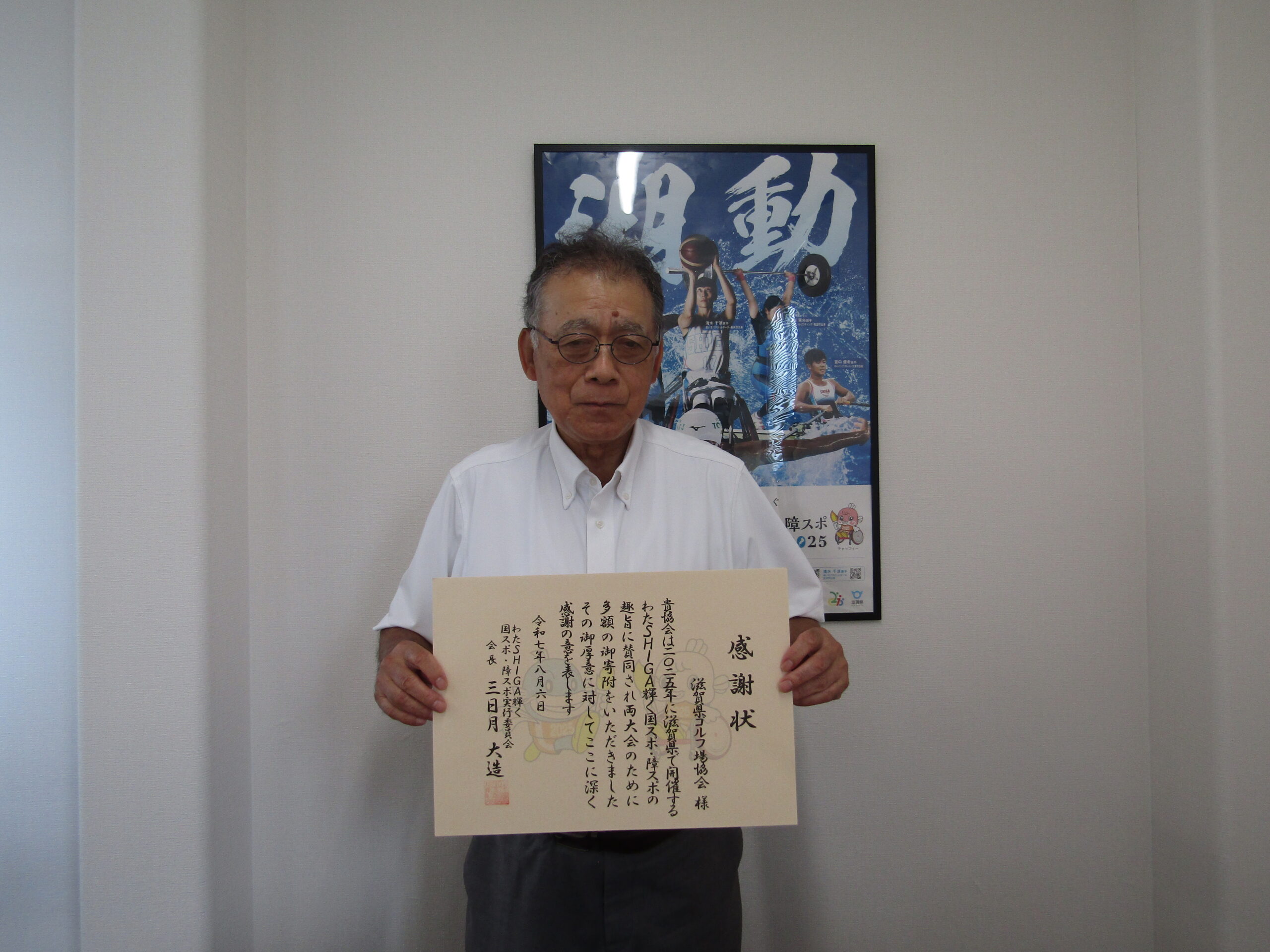 青谷 大地様からいただきました「わたSHIGA輝く国スポ・障スポ」への御寄附に対する感謝状の贈呈を行いました。 いただいた御寄附は競技力の向上に活用させていただきます。
