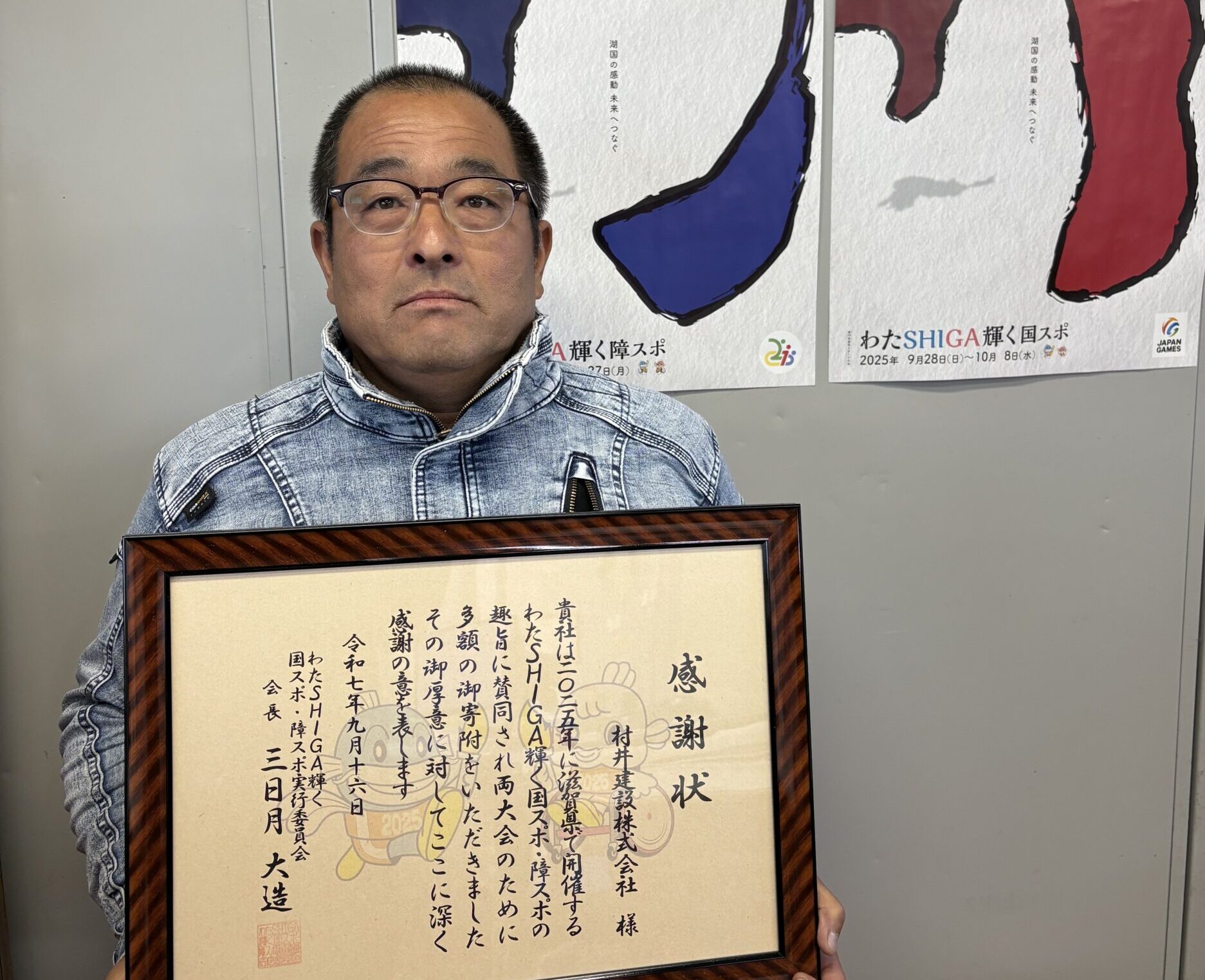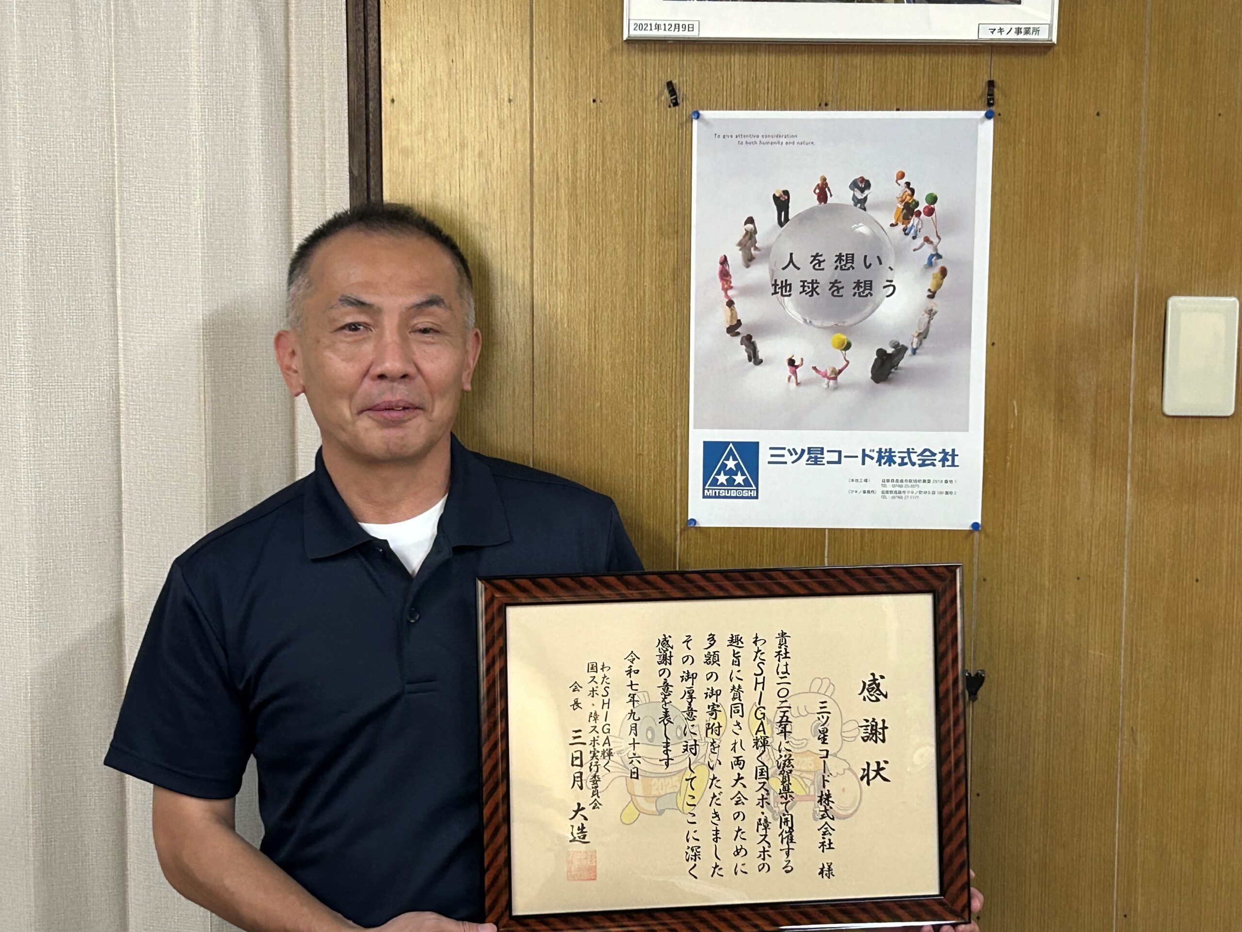 一般社団法人滋賀県警備業協会様を訪問し、「わたSHIGA輝く国スポ・障スポ」への御寄附に対する感謝状の贈呈を行いました。 いただいた御寄附は大会の運営に活用させていただきます。