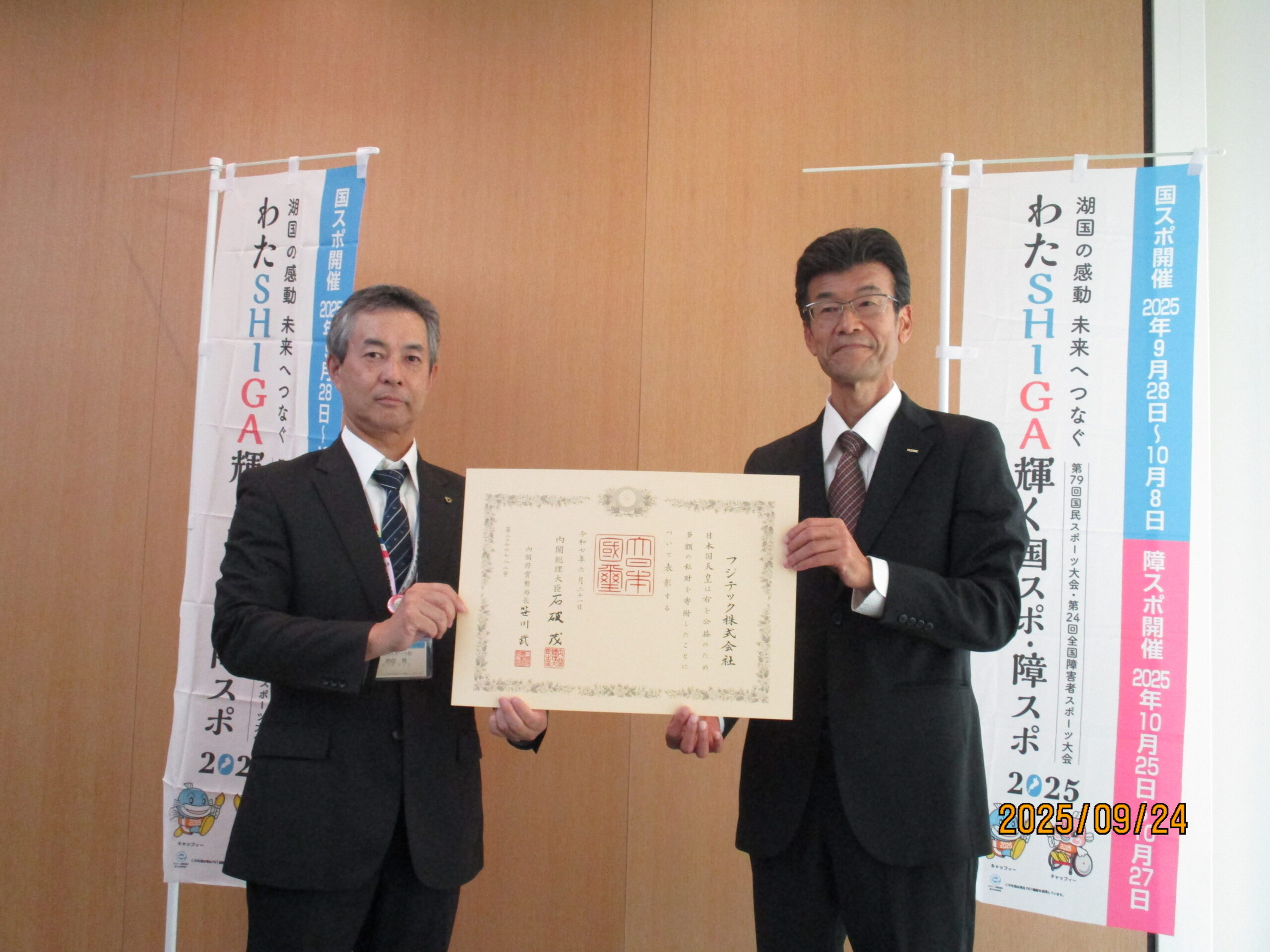 『わたSHIGA輝く国スポ・障スポ』のために御寄附をいただいた綾羽株式会社様に紺綬褒章(褒状)の伝達を行いました。 同社が紺綬褒状を受けられたのは、今回で通算5回目となります。