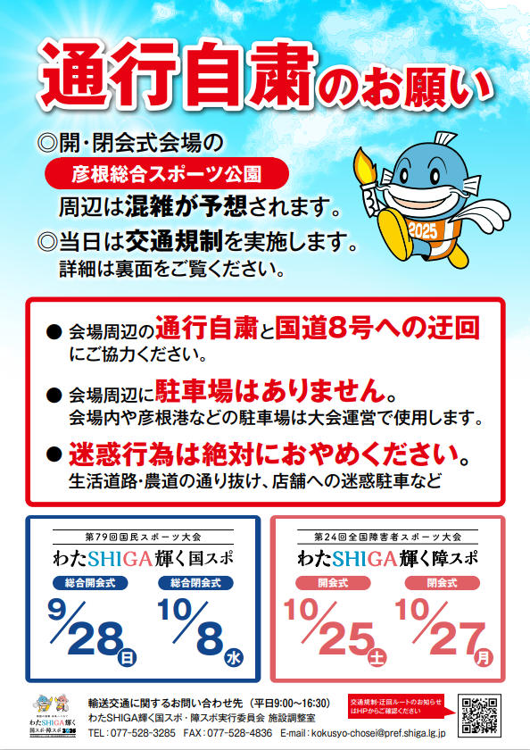 〇「わたSHIGA輝く国スポ・障スポ」の開催に伴い式典日・障スポ競技日【9/28(日)、10/8(水)、10/25(土)、10/26(日)、10/27(月)】は会場(平和堂HATOスタジアム)の周辺道路にて交通規制を実施いたします。渋滞緩和のため、通行自粛・迂回に御理解・御協力をお願いいたします。