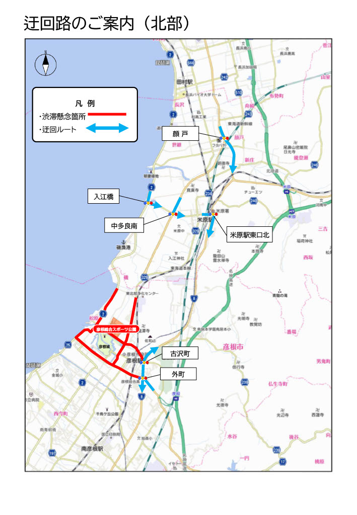 ○具体的には水色のルートでの迂回を推奨しております。南進される車は「顔戸」、「入江橋」、「中多良南」の交差点から国道8号方面に進出して、「米原駅東口北」の交差点から南進してください。北進される車は県道20号(さざなみ街道は「柳川町」を右折)、県道52号(「栗見出在家」を右折)をご利用の上、国道8号に進出して「長野北」、「築瀬町」の交差点から南進してください。